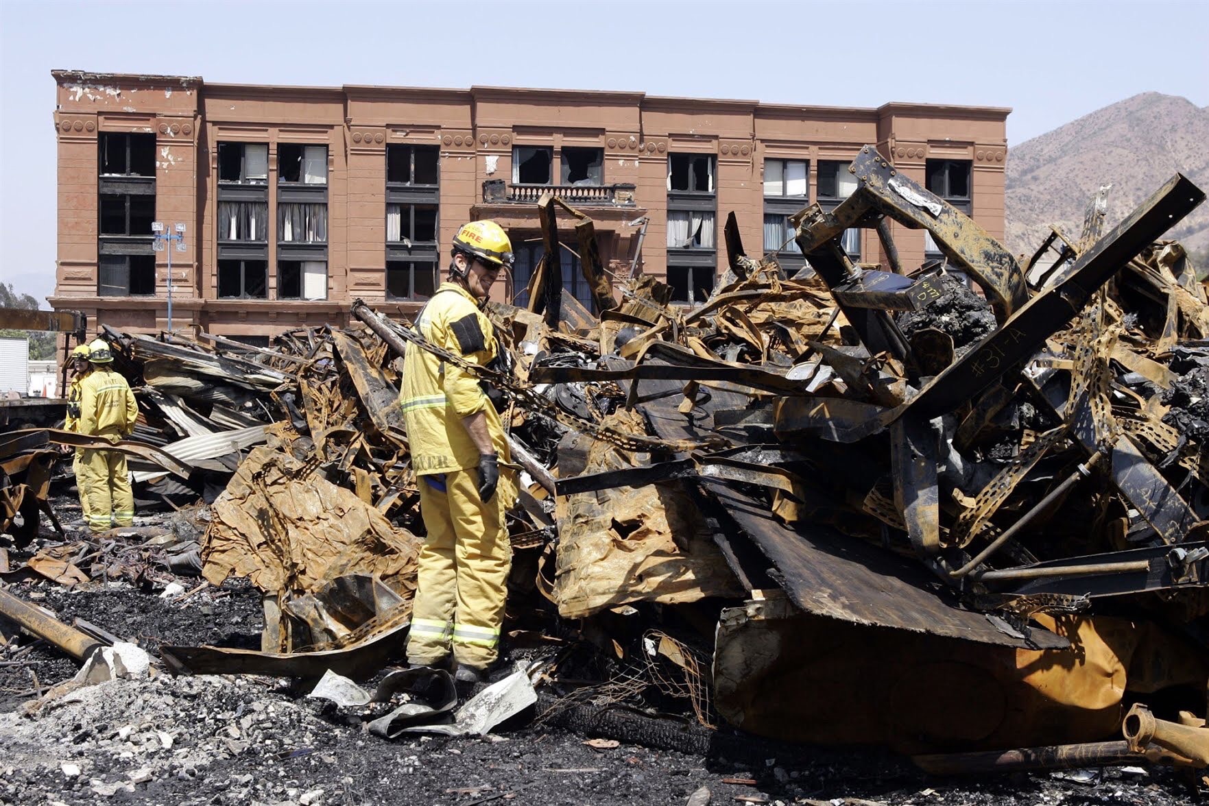 A firefighter examines charred metal at the Universal Studios Hollywood backlot in Los Angeles on June 2, 2008. This was a day after a fire destroyed a warehouse facility housing tens of thousands of master recordings from some of the most important artists in music history. The fire was started by a worker using a blowtorch to warm asphalt shingles being applied to a building facade.