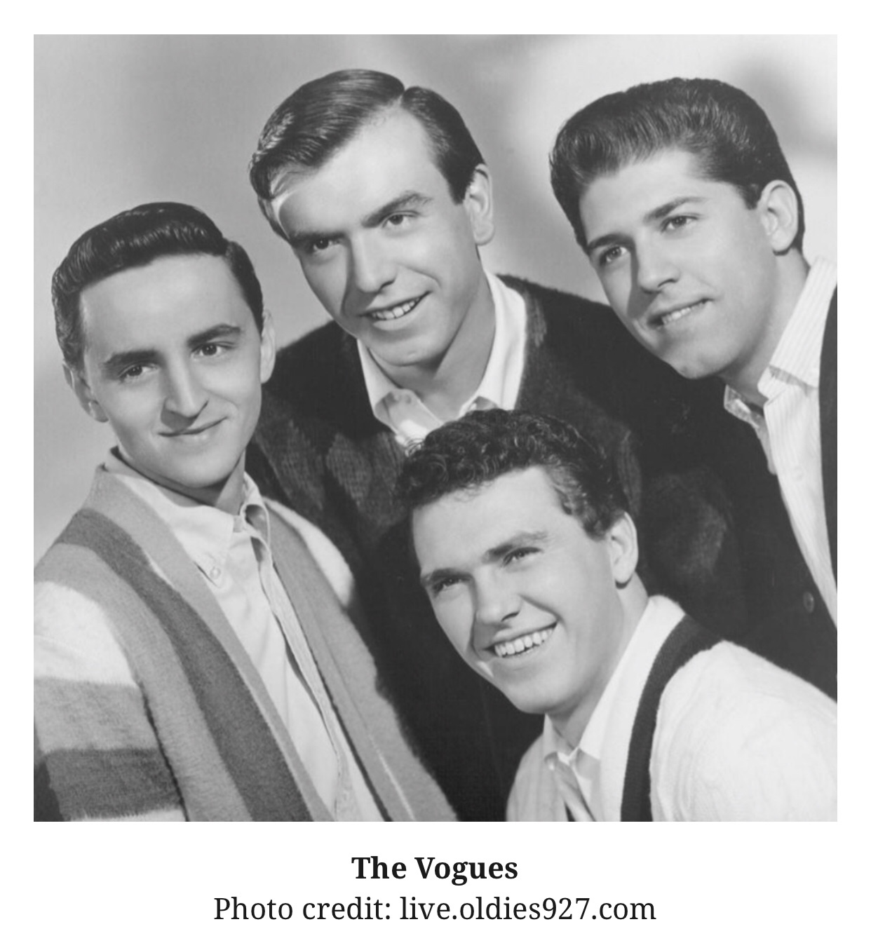 The Vogues are an American vocal group from Turtle Creek, Pennsylvania, a suburb of Pittsburgh. The original lineup consisted of Bill Burkette (lead baritone), Don Miller (baritone), Hugh Geyer (first tenor), and Chuck Blasko (second tenor). They are best known for their chart-topping singles “You’re the One” (https://youtu.be/mOJ071ExDbk) (RQ 10), “Five O’Clock World” (https://youtu.be/ngqqfHPTrHo) (RQ 10+), “Magic Town” (https://youtu.be/S4onTq5Brpk) (RQ 5) and “Turn Around, Look at Me” (https://youtu.be/VrdQwKlbu4Q) (RQ 10+). In addition to touring the world, the group appeared on American Bandstand, The Tonight Show, and The Ed Sullivan Show. They were inducted into the Vocal Group Hall of Fame in 2001.