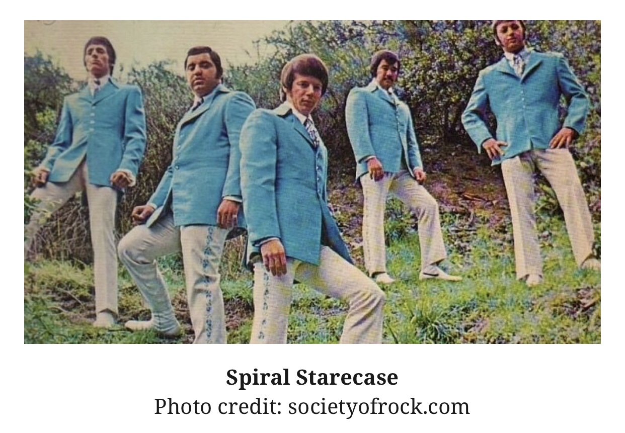 The Spiral Starecase was an American pop band, best known for its 1969 single “More Today Than Yesterday” (https://youtu.be/HRNPppaIW6I) (RQ 10). The band, from Sacramento, California, United States, was recognizable for its horns and lead singer/guitarist Pat Upton’s voice. Thgroup also included Harvey Kaye (organ), Dick Lopes (saxophone), Bobby Raymond (bass guitar), Gene Austin (bass guitar), Vinny Parello (drums), Mark Barrett (drums) and Al Sebay (electric guitar).