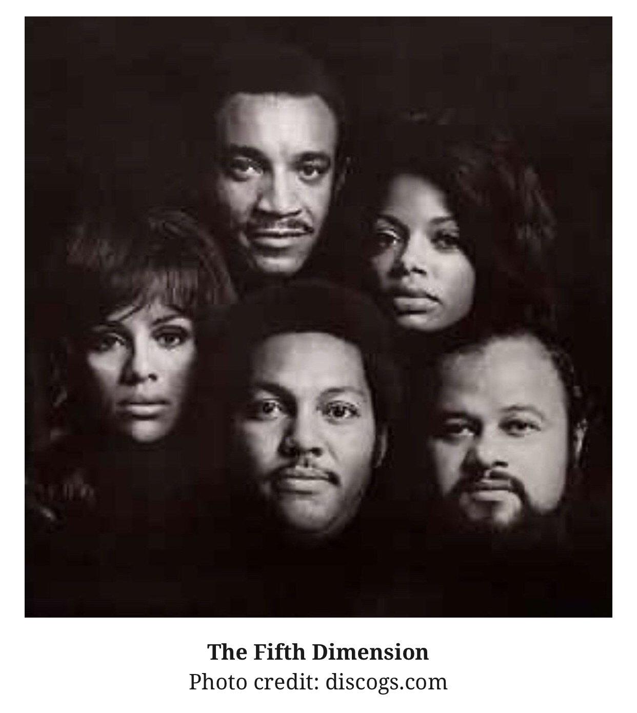 Formed as the Versatiles in late 1965, the group changed its name to “the Fifth Dimension” by 1966. They became well known during the late 1960s and early 1970s for their popular hit songs “Up, Up and Away,”, “Stoned Soul Picnic”, “Medley: Aquarious/Let the Sunshine In” https://youtu.be/VlrQ-bOzpkQ() (RQ 10), “Wedding Bell Blues”,”One Less Bell to Answer”, “Never My Love”, and “(Last Night) I Didn’t Get to Sleep at All” as well as The Magic Garden album. The five original members were: Billy Davis Jr., Florence La Rue, Marilyn McCoo, Lemonte McLemore and Ronald Townson.
