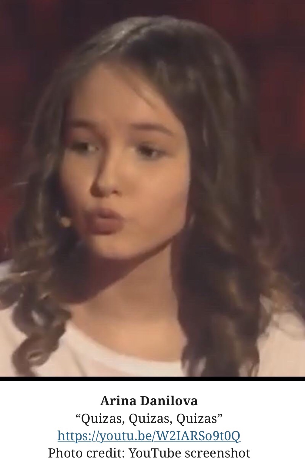 Arina Danilova was born on December 25, 2003 (age 17) in Russia. She is a celebrity youtube star. She is a YouTube content creator and social media influencer who rose to fame by publishing video blogs on her self titled YouTube channel. She has gone on to garner more than 2.2 million subscribers on the platform. An example: “Quizas, Quizas, Quizas” https://youtu.be/W2IARSo9t0Q (RQ 10).
