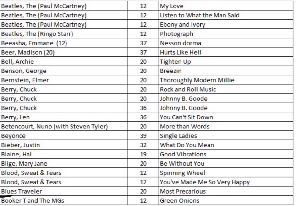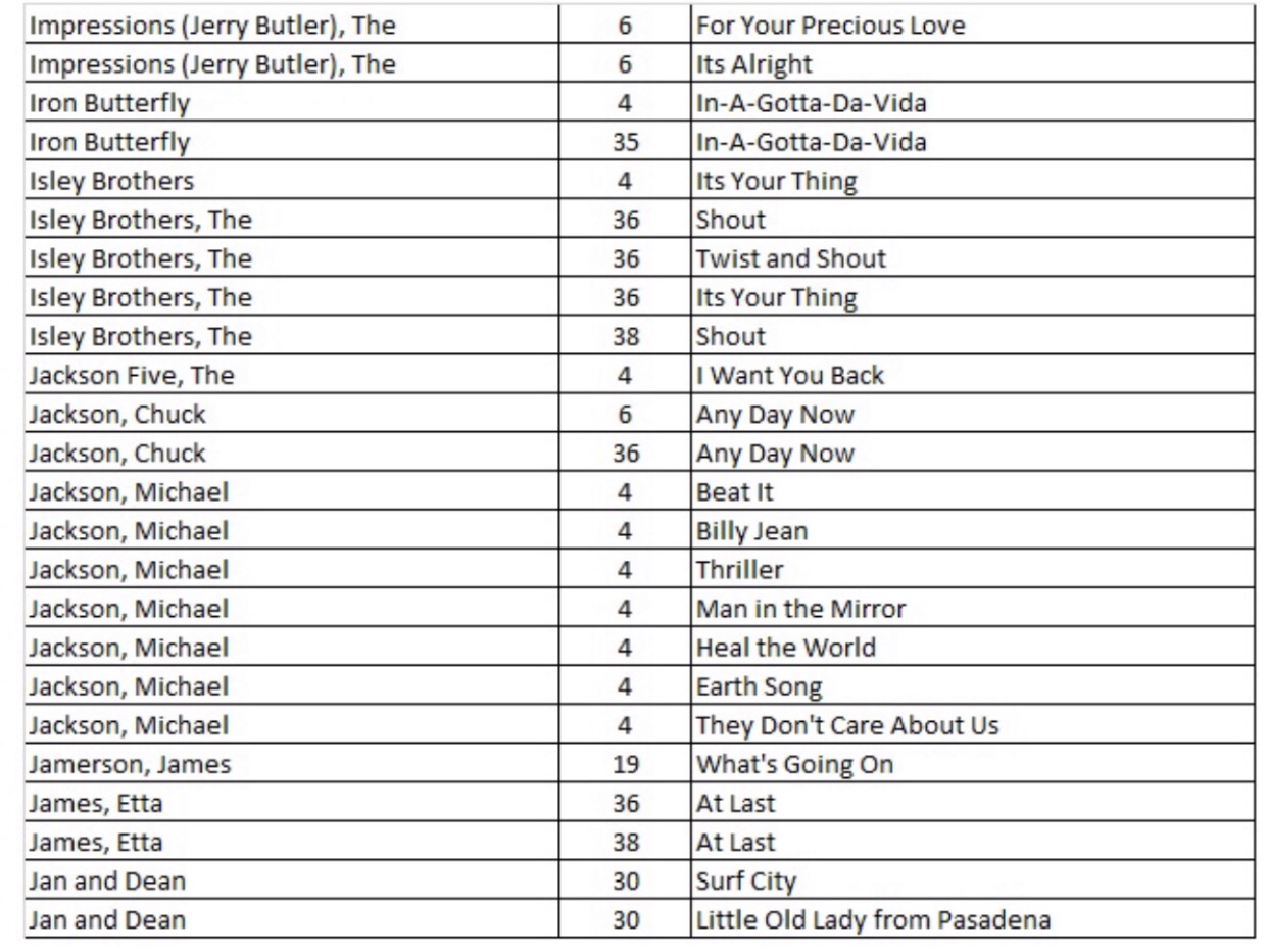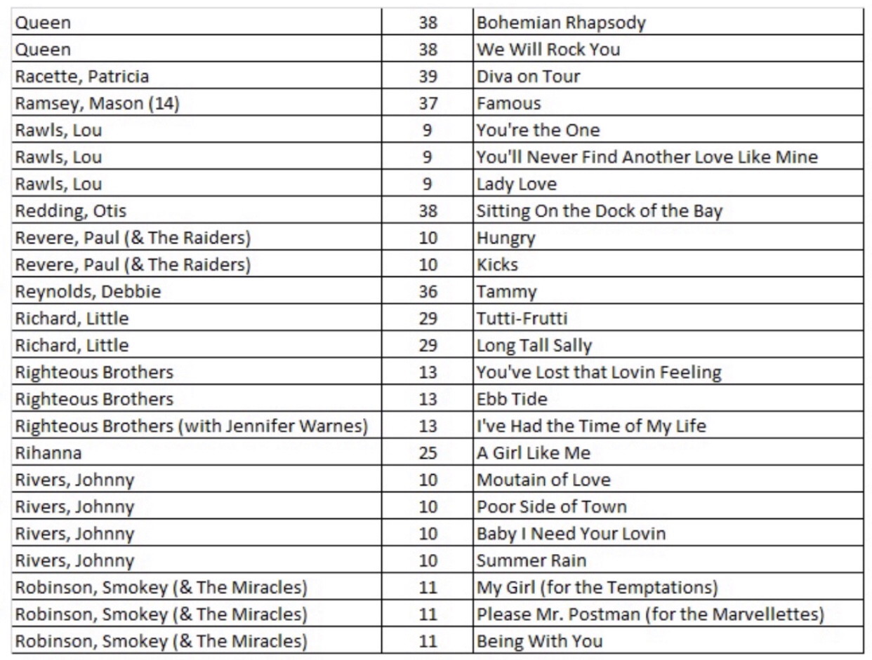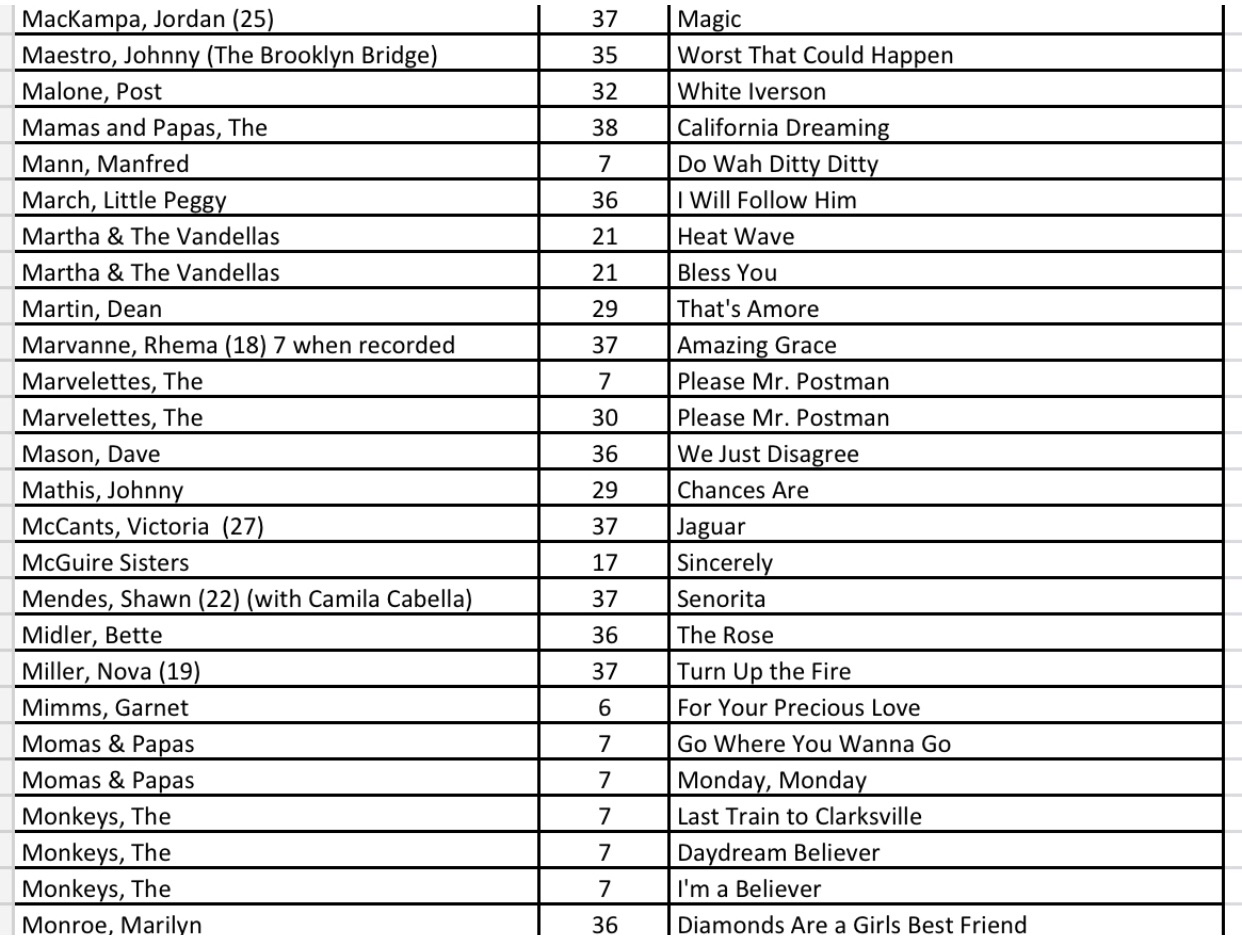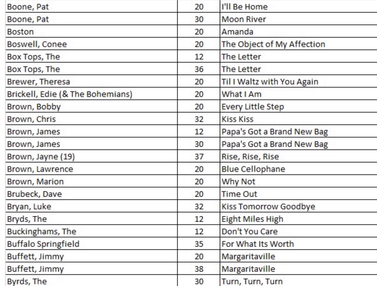 After researching the existing 43 blog posts, we identified 556 songs with a recording quality (RQ) grade of either a 10 or 10+. If you want to quickly find a song with the highest recording quality, I have listed each of the 556 songs with the names of the artists as well as the blog post number that you will find links to allow for quick selections. There are a total of 27 alphabetized charts that follow: