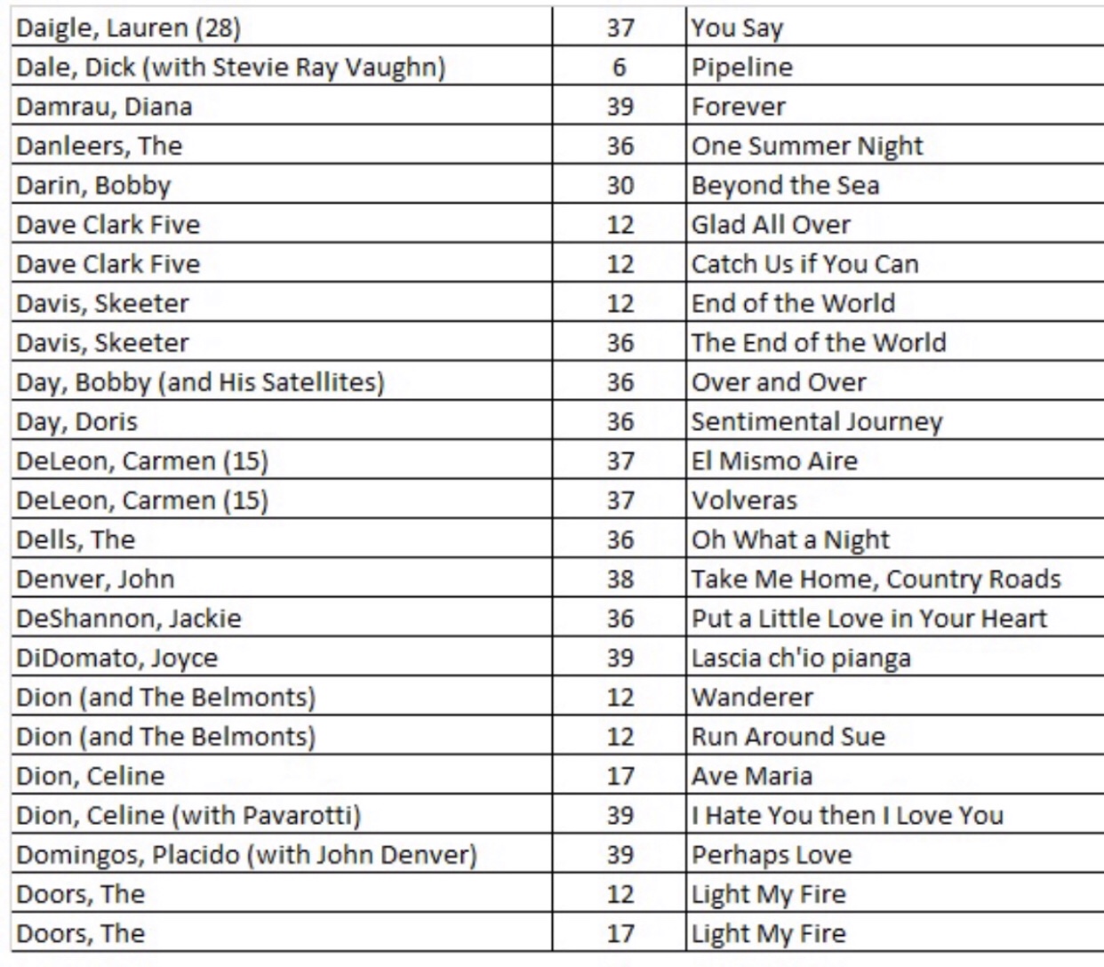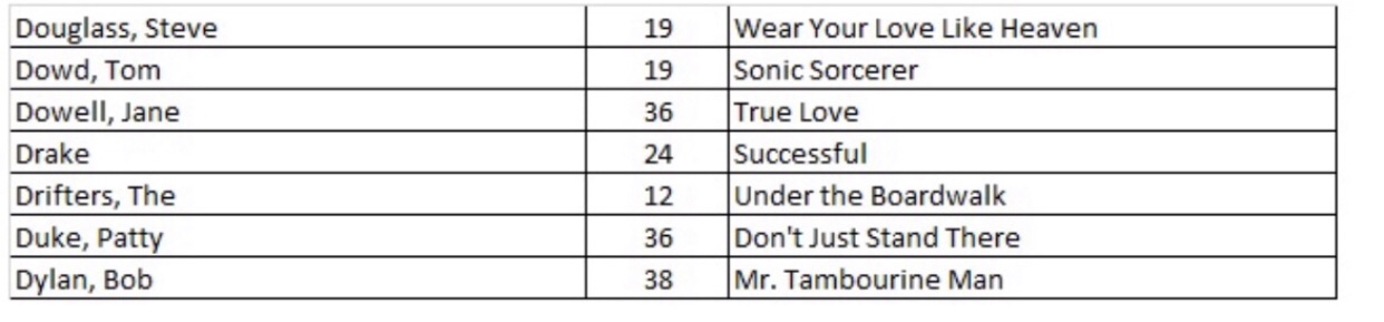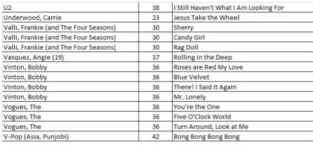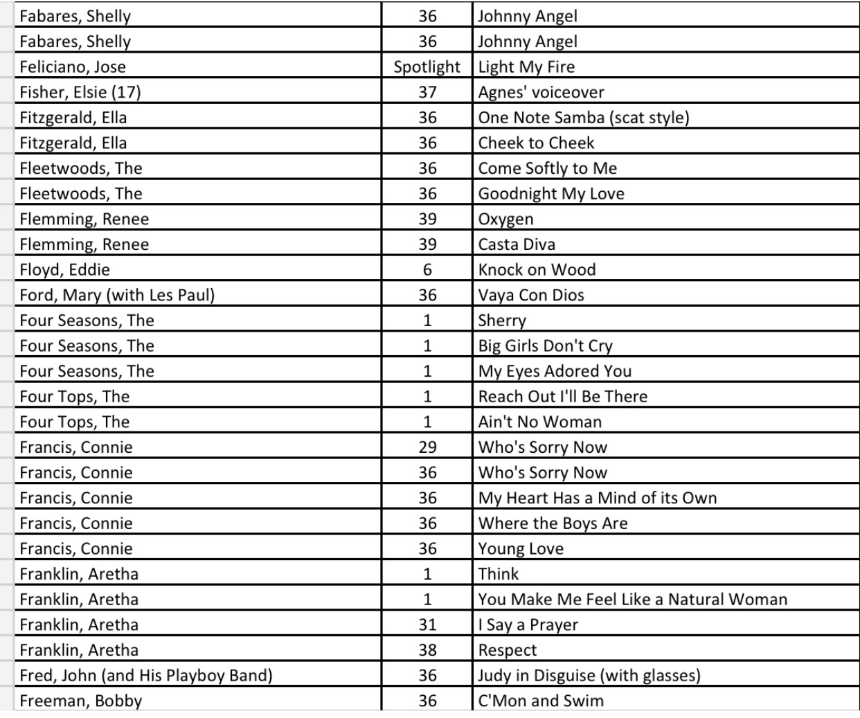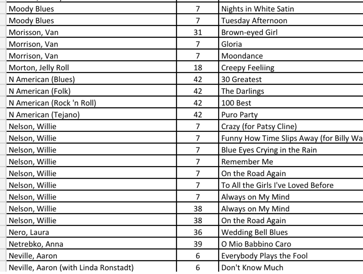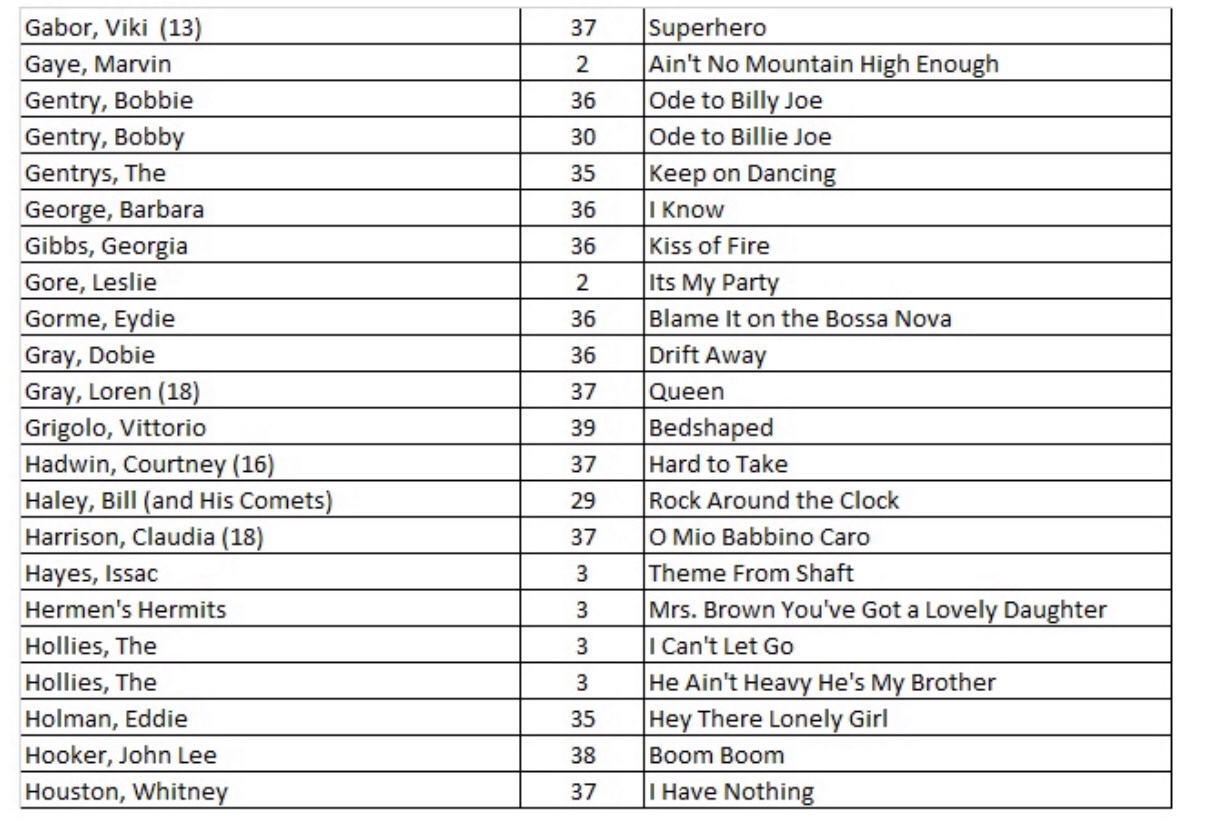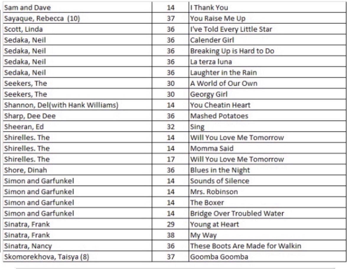 After researching the existing 43 blog posts, we identified 556 songs with a recording quality (RQ) grade of either a 10 or 10+. If you want to quickly find a song with the highest recording quality, I have listed each of the 556 songs with the names of the artists as well as the blog post number that you will find links to allow for quick selections. There are a total of 27 alphabetized charts that follow: