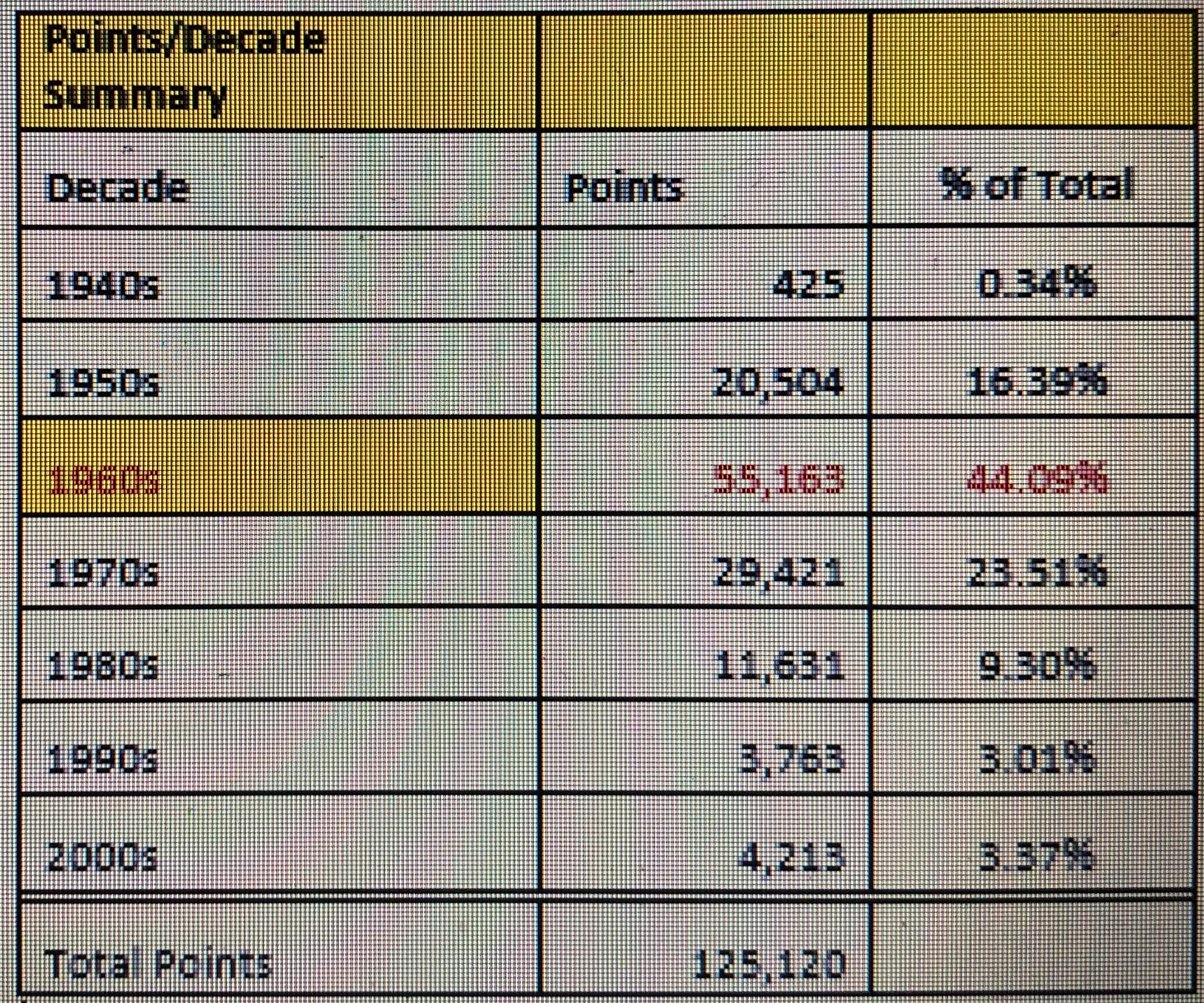 Once I transferred the RollingStone data into an Excel format, I was able to associate points to each of the 500 recordings. The point subtotals in the chart below are separated out between the 1940, 1950, 1960, 1970, 1980, 1990 and early 2000s. The data supports my belief in that about 60% of the best highly rated songs were generated from the artists within the 1950s and 1960s. The point subtotals are derived by giving each song a specific point total depending upon their overall rating. So, starting with the number one song of the 500, it was given the best possible score of 500. Then, proceeding down to 499, the second highest rated song was given 499 points. This continued correspondingly downward to the lowest rated song which was given a score of one.