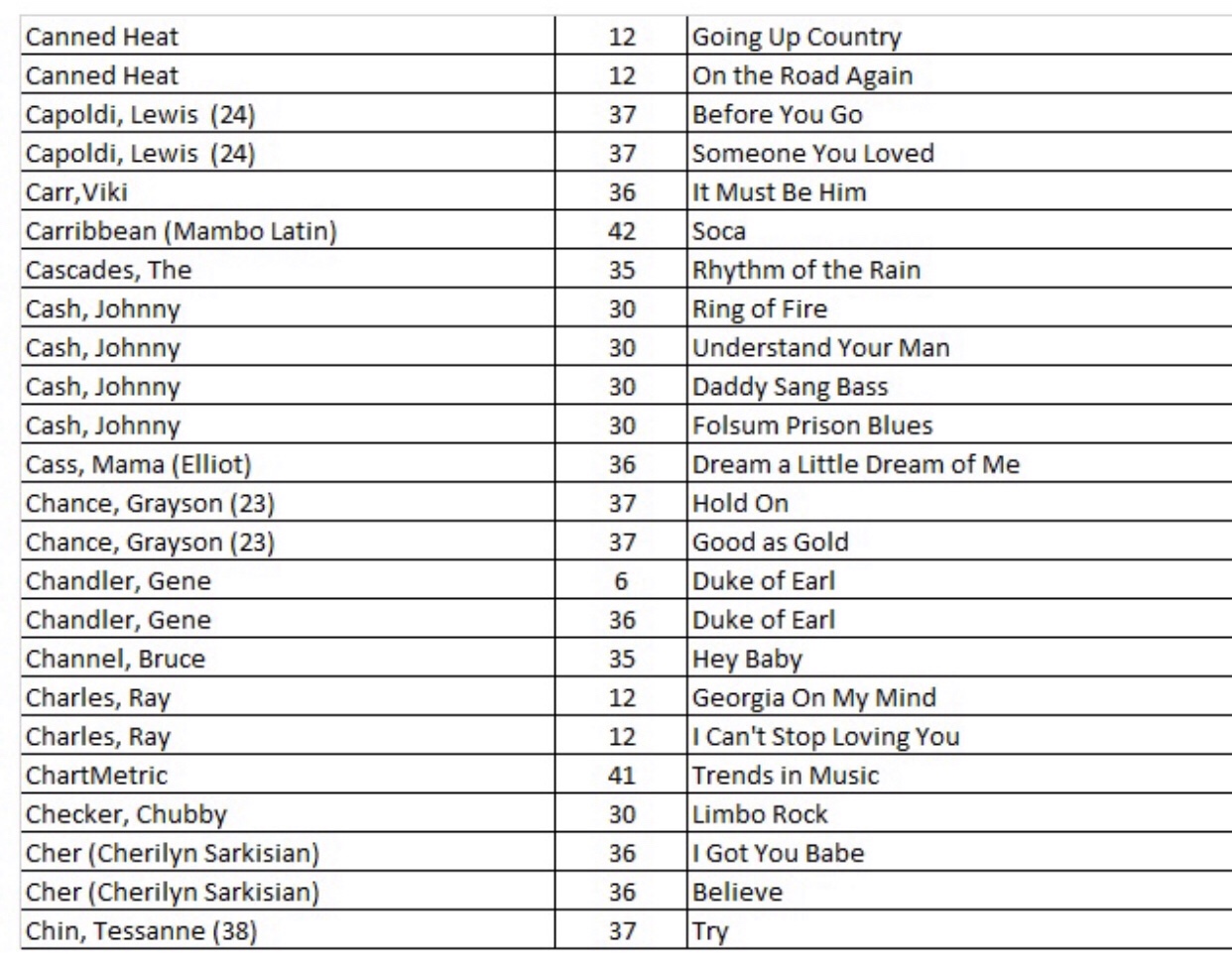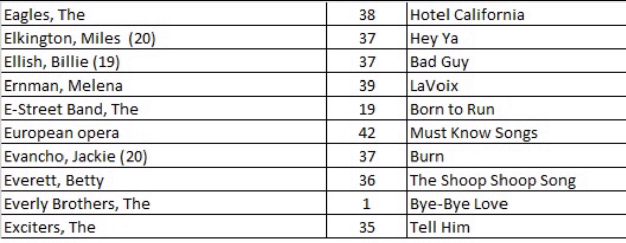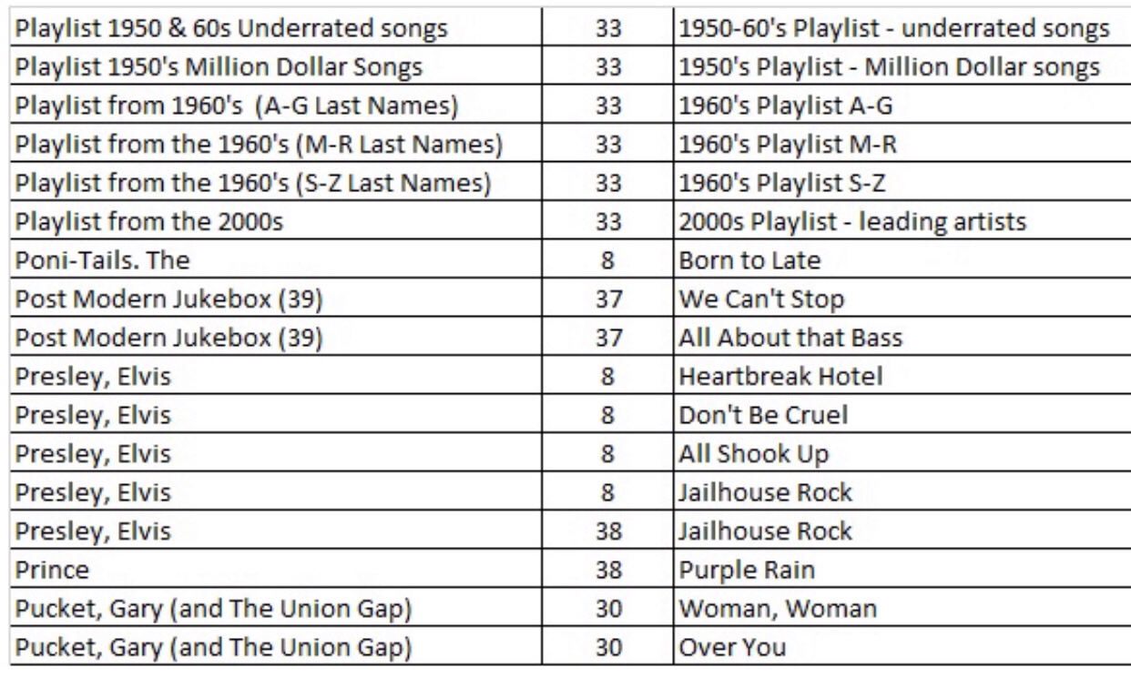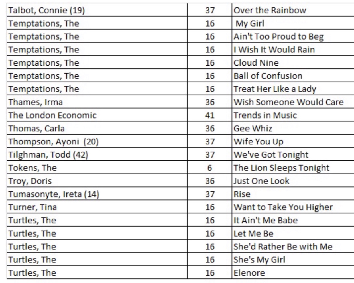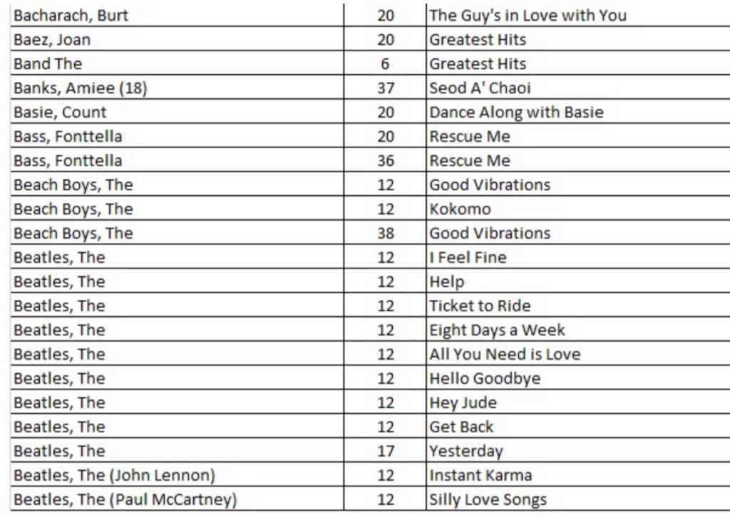 In case you are interested, here is a quick summary of the most productive artists beginning with the best overall on top (their point totals are in the middle column and the total number of highly rated songs are in the right hand column):