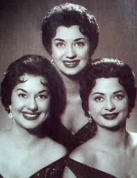 The DeCastro Sisters (1946-1954) began as a Latin-flavored trio and were protegees of Carmen Miranda. They eventually became more Americanized in their performances and added comedy. The biggest hit single for the group was “Teach Me Tonight” (https://youtu.be/A1o57qfBV54), in 1954. The song reached No. 2 in the United States, and the follow-up, “Boom Boom Boomerang (song)|Boom Boom Boomerang”, reached No. 17. The group is referenced in an episode of The Sopranos, “Do Not Resuscitate”, as one of the only music groups that matriarch Livia actually likes, along with Mario Lanza. The three original DeCastro Sisters — Peggy, Cherie and Babette — were raised in Havana, Cuba, in a family mansion that was seized by Fidel Castro during the Cuban revolution and is now used as the Chinese Embassy. Their mother, Babette Buchanan, was a Chicago-born Ziegfeld Follies showgirl who married the wealthy Cuban aristocrat Juan Fernandez de Castro, owner of a large sugar plantation in the Dominican Republic, where first daughter Peggy was born. De Castro later developed radio and television in Cuba with David Sarnoff, who was often a guest at their home and was also in charge of a planned project under the Batista regime to build a canal through Cuba, which never materialized.