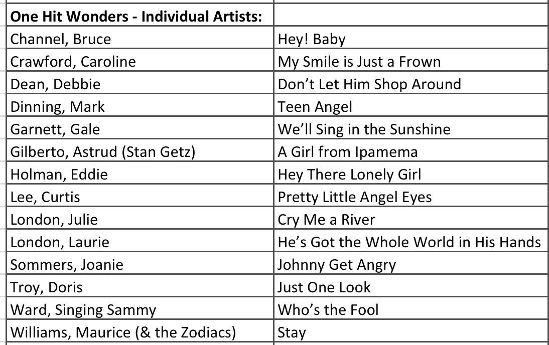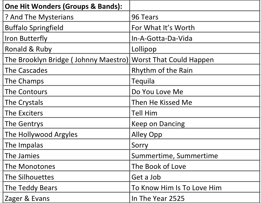 Manfred Mann “Doo Wah Diddy Ditty,” The Marvelettes “Mr. Postman,” The Mamas and the Papas “Monday Monday,” The Monkeys “Daydream Believer,” The Moody Blues “Nights in White Satin,” Van Morrison (Them) “Gloria,” Pink Floyd “See Emily Play,” Elvis Presley “Heartbreak Hotel,” Paul Revere and the Raiders “Good Thing,” Righteous Brothers “Unchained Melody,” Johnny Rivers “Mountain of Love,” Tommy Roe “Sheila,” The Miracles “Shop Around,” The Rolling Stones “I Can’t Get No Satisfaction,” and The Ronettes “Walking in the Rain.”