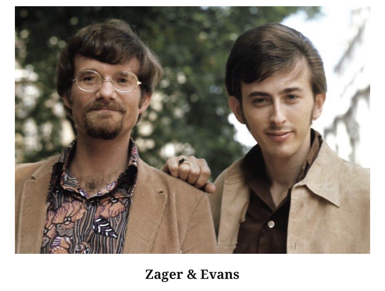 Zager and Evans was an American rock-pop duo active during the late 1960s and early 1970s, named after its two members, Denny Zager (born 1944, Wymore, Nebraska) and Rick Evans (born 1943, Lincoln, Nebraska, died 2018, Santa Fe, New Mexico). They are best known for their 1969 No. 1 hit single “In the Year 2525” (https://youtu.be/zKQfxi8V5FA) (RQ 10) which earned them one-hit wonder status.